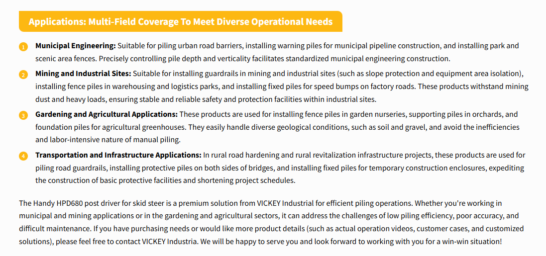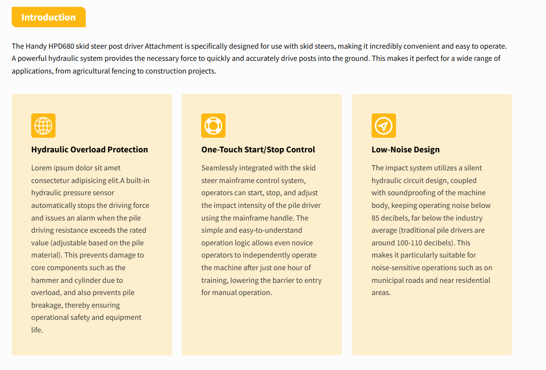 Seamlessly integrated with the skid steer mainframe control system, operators can start, stop, and adjust the impact intensity of the pile driver using the mainframe handle. The simple and easy-to-understand operation logic allows even novice operators to independently operate the machine after just one hour of training, lowering the barrier to entry for manual operation.